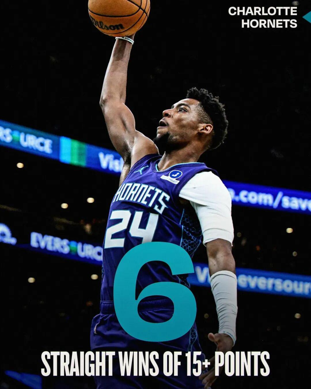 在客场118-89大胜凯尔特人之后,黄蜂取得了一波6连胜,而且这6场比赛赢得非常残暴:
